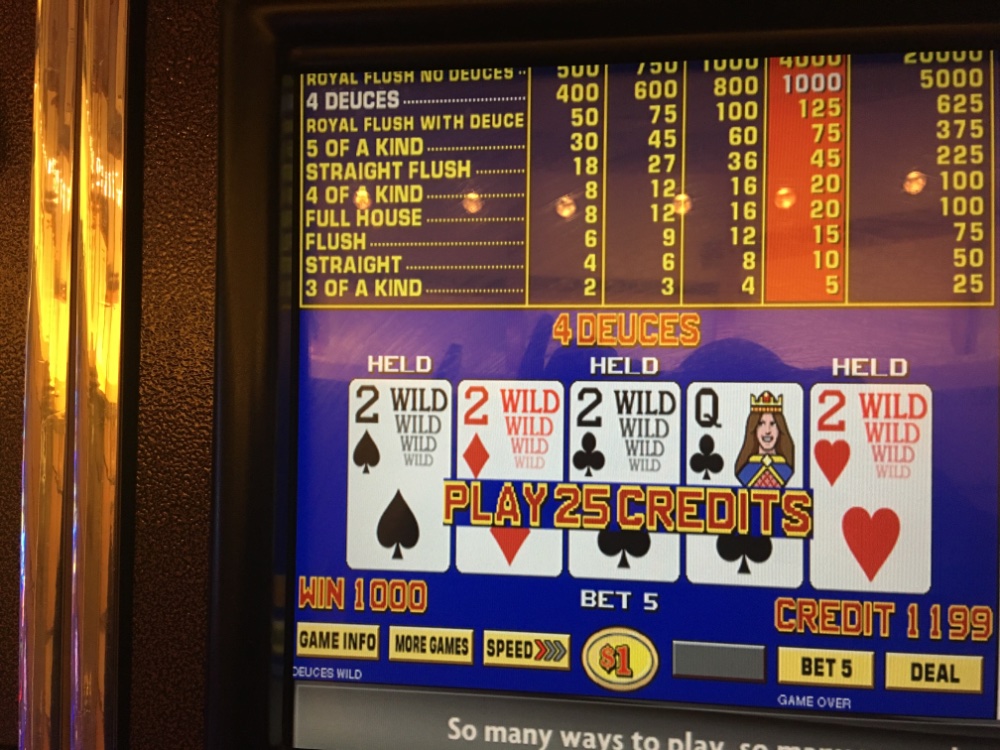 Yeah, the worst case scenario. But you get remarkable value for your buck in DW. Just shy of a hand pay for a lousy $5.50 bet? I had to bet $10 for my $800 quad Aces. Chasing quad deuces is basically the same as Aces. There are only four of each available. I suddenly feel gouged.