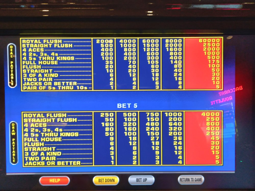 I play 9/7 TDB where the Draw table pays 99.58%, and the Deal pays 98.86% resulting in a decrease overall to 99.22% (according to WoO). Seems to be opposite of the above example. In poorer Draw tables they will also frequently shortchange full house and flush on the deal table. In the TDB version you want to see 250 & 100. I have seen 200 or 175 and 80 on poor tables/lower denominations which makes a lousy game horrendous. In addition to relying on kicker hands to tread water in the DDB and TDB versions, an absence of dealt straights, flushes and full houses will often result in ruin. Even at 99.22% you can lose money at an alarming rate.