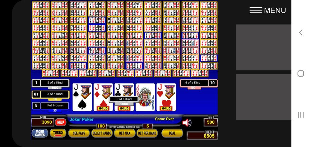 Just a little extra info on this game. It relies heavily on quads in the total return, nearly 15 percent, but in the long run they come in about every 118 hands at 17 for one. The Royal every in round numbers every 38,500 hands so a little more often than most games. It will give you a five of a kind about every 10,800 hands at 200 for one, a Wild Royal about every 10,300 hands at 100 for one, a Straight Flush every 1,700 hands at 50 for one, and quads every 118 hands at 17 for one.