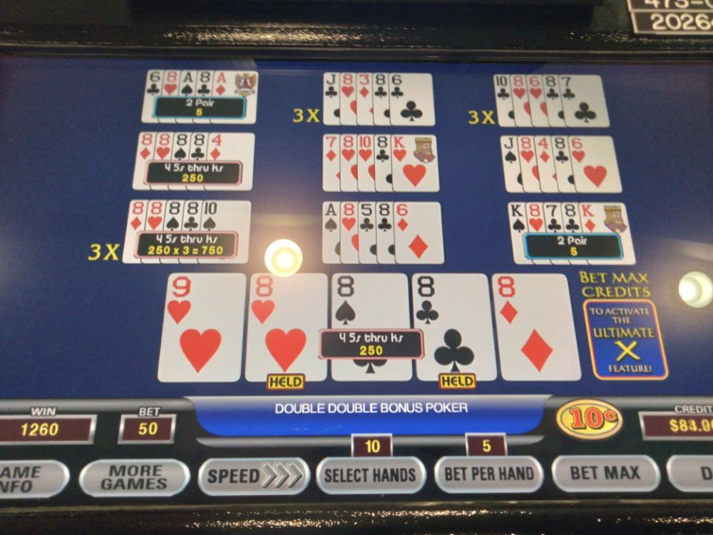 Although the $100 full house was nice, I particularly like the THREE quad 8's on the 10 play holding just a pair of them.