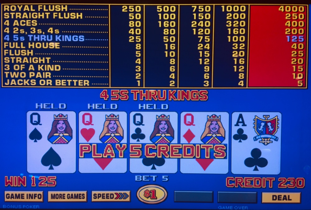 Sad Saturday. Frazzled by traffic, so I stuck with Caesars. I won $15 on Caesars dollar JOB FP. The usual loss hour ensued. I was net -$300 when I hit my first max quad. Fortunately, the next one came at the adjacent machine three minutes later. Fifteen minutes later, my pal SF came while slumming on quarter JOB. I usually stop here, but I craved more. After losing $150, SF’s dollar brother came! Lunch at Kwi. I hit the sports lounge and later lost $6 chasing another quad. Net Day: -$97. 126 TCs.