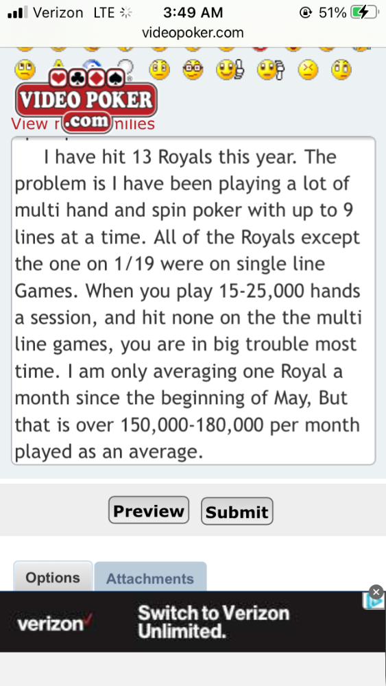 If I looked at the pay-table correctly, that is an 8/5 DDB game. Not good. Besides writing about by two stretches of 600,000 hand no Royals, I have written many times on what none of us like to hear and that is long term results that match the pay tables can be longer than one’s lifetime. After a banner start this year, I am in a serious dud cycle in not hitting even medium type hands to keep me playing. The Royals are in a dud cycle too. I don’t like to even write about this. Hopefully things have changed, but my vp bud Wildman has written about similar results lately. There is no way to turn these things. You have to either quit or make sure to play within your means assuming which again and I hate to say, that your money is gone before the first hundred gets sucked into the machine. Play the best paytable you can find, play slow enough so you don’t make needless errors, and make sure your strategy is down pat and or you have something with you to look up a questionable hold.