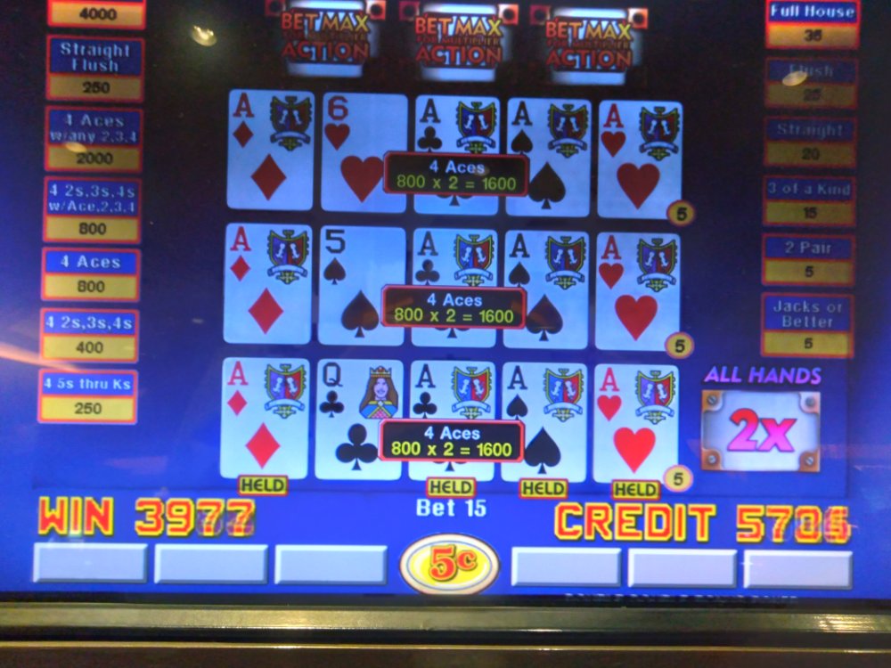 I know. It almost seemed like it was a conspiracy. I've hit a LOT of 4 aces with a kicker on poker games where there's no bonus for that. I remember once I was playing DDB Poker and getting nowhere and changed to Deuces Wild and the very first hand after switching it just dealt me 4 aces and a kicker! But being deuces wild all I got was $20 for it!
