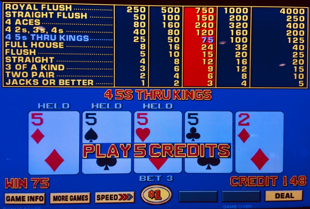 Was just ball parking your playing time at about 3 hours. In that time hitting 7 quads and a straight flush one of which was the better paying low number on BP. Just reinforces to me how important Royals are in those games. Unless one hits and runs early on, the end result after hours of play is almost always negative without a Royal. On quadless days, I have given up as much as 25 percent of coin in on JOB. If I remember, and it has been a while, Bob Dancer has too.