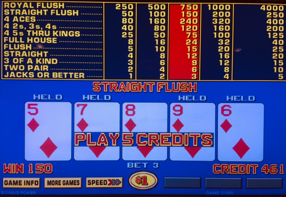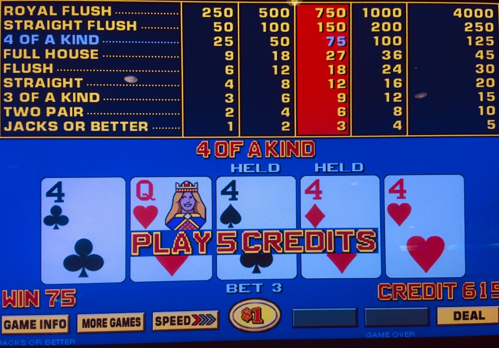 Was just ball parking your playing time at about 3 hours. In that time hitting 7 quads and a straight flush one of which was the better paying low number on BP. Just reinforces to me how important Royals are in those games. Unless one hits and runs early on, the end result after hours of play is almost always negative without a Royal. On quadless days, I have given up as much as 25 percent of coin in on JOB. If I remember, and it has been a while, Bob Dancer has too.