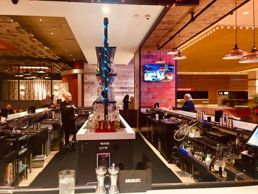 A trio of quads and a craps hit yielded poor profit. Austerity suggests an appetizer to tide me over. Bally’s Water Dog features quad shrimp wrapped in smoked bacon atop an orange glaze. Basil and extra virgin olive oil complete the delectable dish. The trick is using a fork to surgically extract the jumbos from the two thick skewers. Unwrapping them allows one to cut the bacon fat, saving calories. The bar stools cannot be more uncomfortable. But a happy hour win win nonetheless.