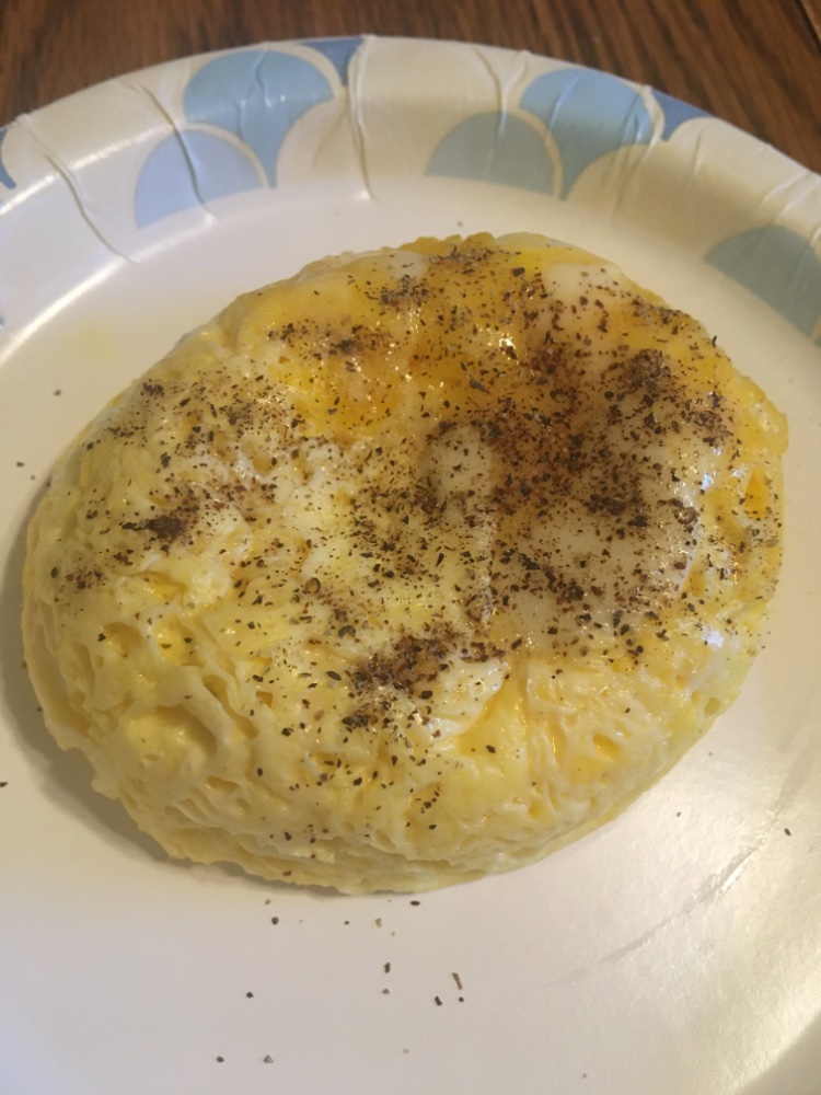 Round or oval clear pyrex dish. Spray lightly with Pam or smear with soft butter inside. Crack two eggs into the dish and scramble for a few seconds. Break up one slice of American cheese and place on top. Microwave on high about 45 seconds. Check it out and you will probably need another 30 seconds or so. Even with the turntable and cover, I usually put it back into a different part of the microwave. My microwave s 900 watt. Times will vary a bit. When done, flip over the dish onto your plate, add black or white pepper or whatever you like maybe Franks and enjoy. If you don’t mind the carbs or extra calories, enjoy on toast or a roll.