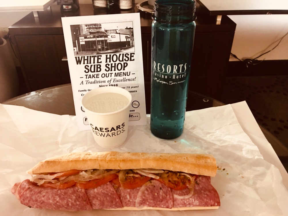 I recently returned to White House Sub Shop. Covid has badly diluted the experience. No entering to discuss your order details with the makers. Just order through an open window, hope they get it right and wait until your name is yelled. Scene looks like a drug deal about to be consummated. They left out the oil, which provides moisture and contrast. The Half Special is still a great sub at its usual size, with extra ham, salami, provolone, cap. Like casinos, it never closes. But still a bit hungry. $10.45 with tax. Hard Rock outpost allows a more personal touch and seating; out of my way this trip. Most add the hot peppers, but I hate them.