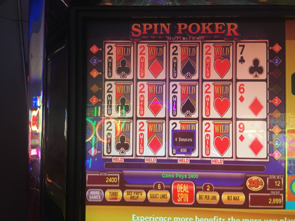 We didn’t speak at all. I notice he kept watching my play which was 3 line Joker Kings at a quarter a line 98.44 and 940/1 for the Royal. He cringed as did I when 4 Aces without a joker hit 5 minutes apart. My guess is he either played that machine earlier, or wanted to play it when I left until he saw the Aces. Most players would be too Superstitious and not play that machine if they saw Aces come out like that. I know it means nothing but even for me it is hard to overcome the superstition sometimes.