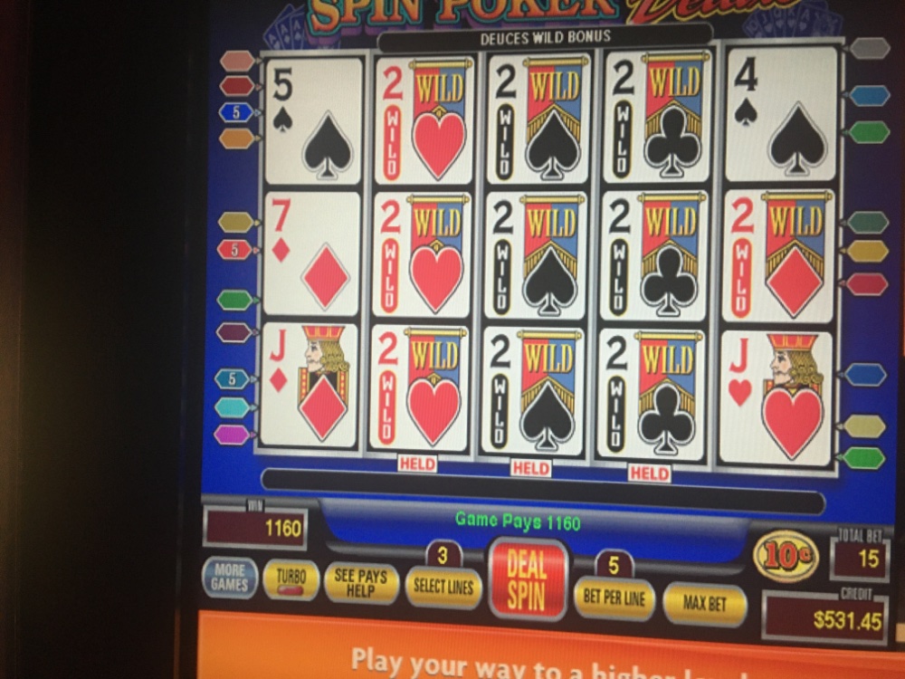 I believe this is the only low denomination machine at Mohegan sun. All star two has regular deuces wild but I don’t believe it has bonus juices. I haven’t searched thoroughly though. There is one machine that I also like to play that’s in the 97% range but it requires a big bankroll. It is also a spin poker option game but it only goes up to nine lines. On the other hand it pays 800 for the royal for about 1/4 which is a big plus. And pets are allowed up to 15 for a line. This bonusDeuces wild on spin poker deluxe is usually very busy that’s why I play it overnight into the wee hours of the morning