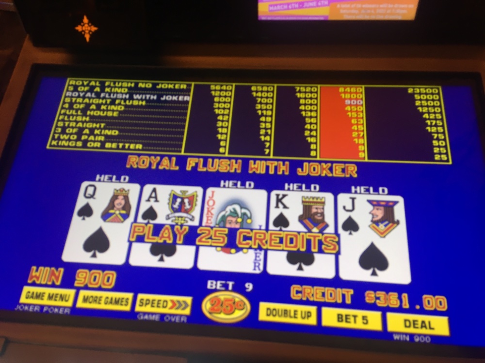 It was definitely a redraw the machine automatically puts the held markers on it when it re-draws the cards. I don’t know if I have seen that before although I think the last one I had did the same thing a year or so ago. One very strange thing is I was playing multi line Nickels deuces wild when I first got to the casino for several hours and even playing between three and nine lines I couldn’t hit anything. So strange. Then I go play a single line game and get the big four deuces hit and the Royal On the same machine. The other hits toward the end of the session We’re on a different machine. It’s just impossible to figure out video poker that’s for sure I guess if there was really good consistency they wouldn’t be in business. I almost give up making corrections to Siri. You never know what she is going to type including wacko punctuation and capitalization. I think it’s faster for me just to type everything, but I make a lot of typos as well because I have an old SE phone with a small screen and more often than not typing something without my glasses. That’s a senior for you!!!