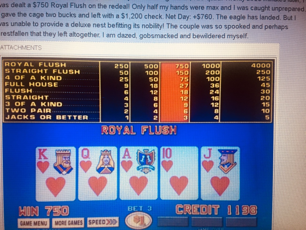 I was very lucky in Bizarro world last night and this morning. Foolishly gave most of the Deuces hit back last night and finally got to sleep about 8 this morning. Am leaving now. I had a funny feeling about this morning, but gunshy from last night. Budgeted 200 a few minutes ago. Hit this within five minutes. I’m outta here. Lucky to finish a bit better than even. Extremely lucky! Off to the Animal shelter on the way home.