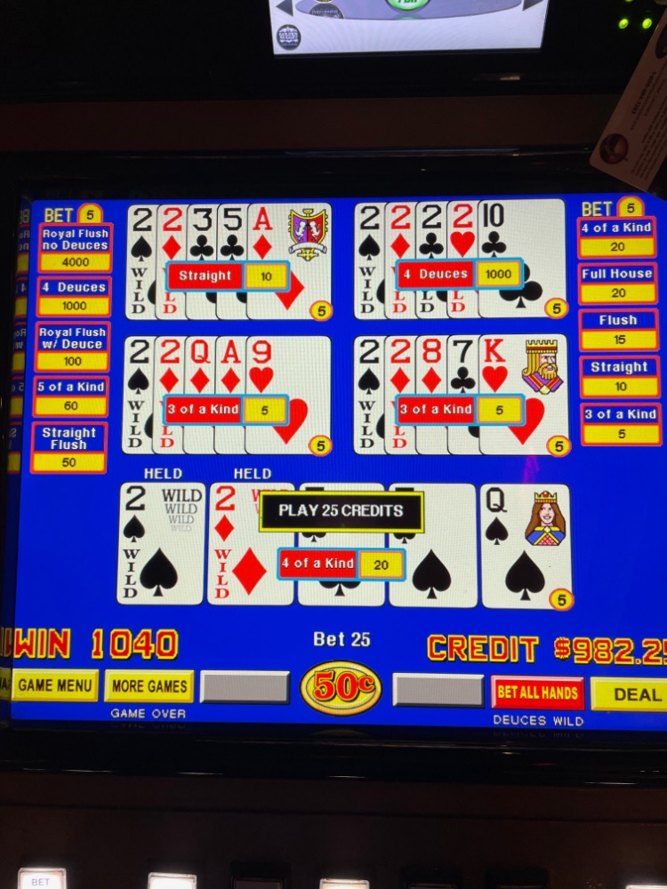 First, quad deuces on 50¢ Then this Royal. Then this Royal: Then Aces/Kicker: Ended up being a nice night after all. With the severe weather coming in we stayed over Tuesday to "Shelter in Place" and headed home Wednesday.