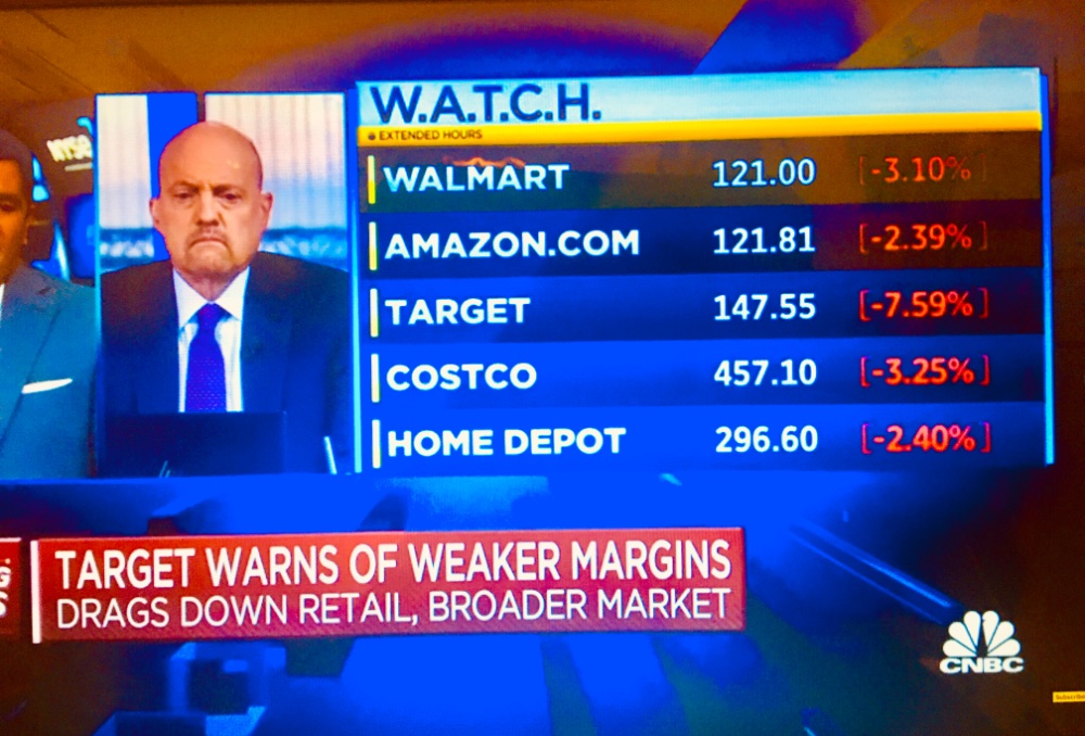 Retail apocalypse resumes. Target warning sends it tumbling. Plenty collateral damage. I sold only one here at a minor -5% loss last week for more cash weight and to avoid this very mess. Adios, Home Zero. Only Watch Party here is a horror show.