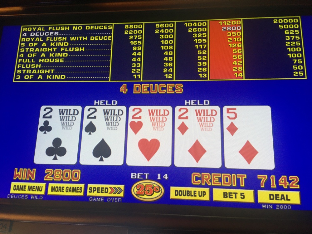 Had a successful session and trip last night for a change. I stuck with single line airport deuces and with the clone caught the quad deuces twice. Once with 14 bet and once 13 bet. Only one pic because my phone says storage full and it isn’t. I read this is a continuing problem with the iPhones. I have done all the usual steps to free storage. No luck. Of 32 gigs, I am using only 8 after adding them up. So no more pics till I get this figured out may have to buy more. Of course, that is what they want you to do. I have already deleted over half my pics and done other things. No good.