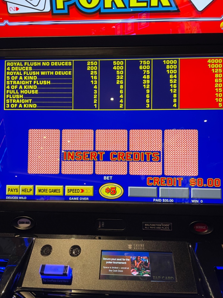 My Bad. Apparently I missed read the pay table. Thank you checking I really thought I found a full pay on a cruise ship. I did play a short session on DW however my game is DDB. My wife hit the deuces.