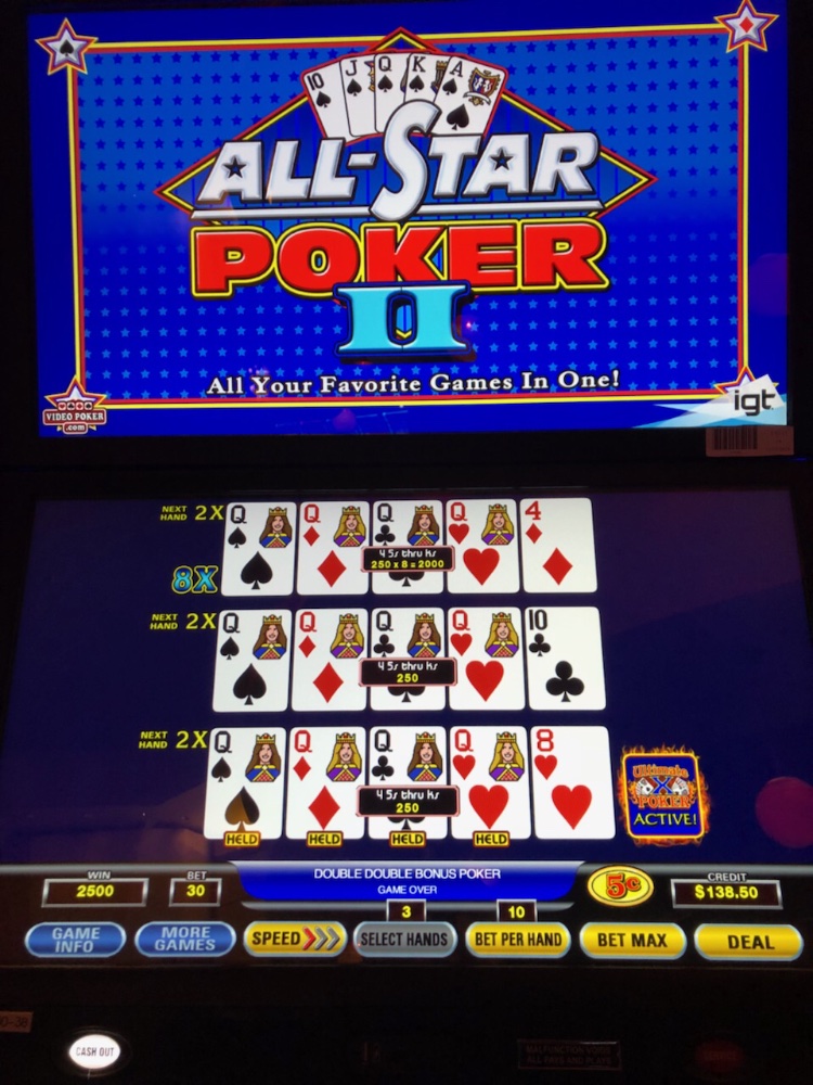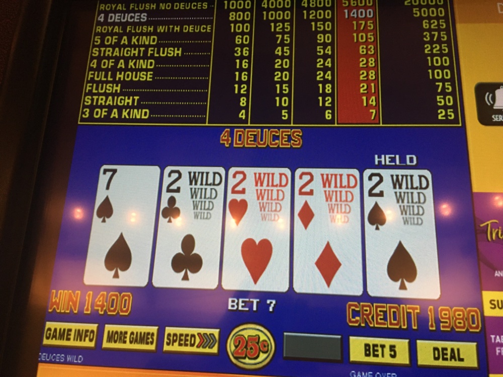 After being so short on quad deuces on the last session, I decided last minute to play quarter airport deuces single line hoping the quad deuces would play catch-up. I would save the triple spin poker for next time. Make a long story short I nailed the quad deuces twice using a fairly aggressive form of the martingale clone.The highest bet I had to play was 18 quarters which is plenty steep. I didn’t have to switch to halves or dollars luckily, and caught the quad deuces twice and to top it off, I only held one deuce both times.
