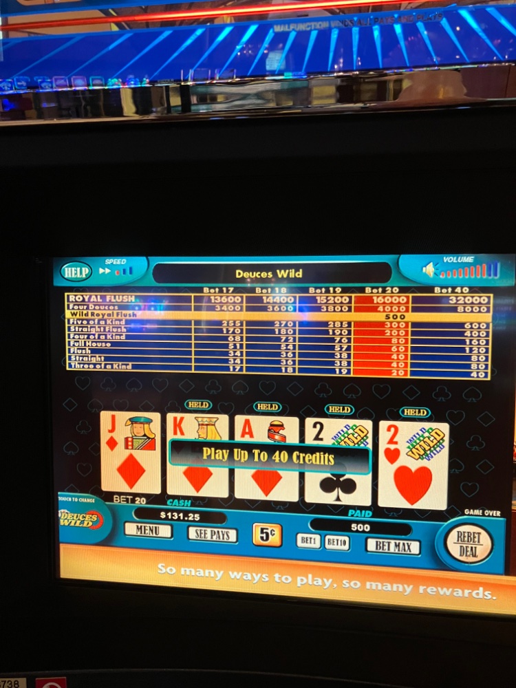 The machine I wanted was out of service so I played an ancient nickel machine with horrible odds Deuces Wild. Somewhere around 95 percent. The only good thing is it goes up to bet 40 do it is great for the clone. I put in a hundred and this is where I stand now. Got 4 of these so far. Only took one pic. I’m trying to get it up to 150 bucks and turn in then head home late morning. Be taking a coffee break in ten minutes.