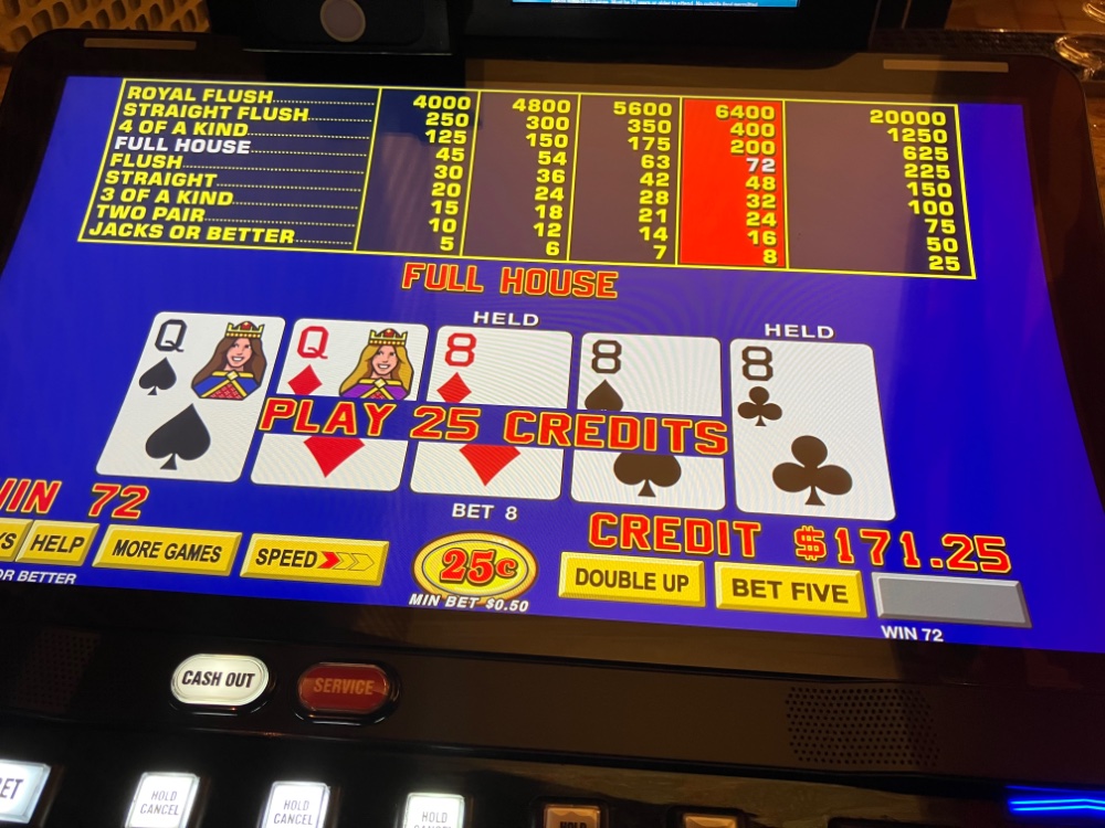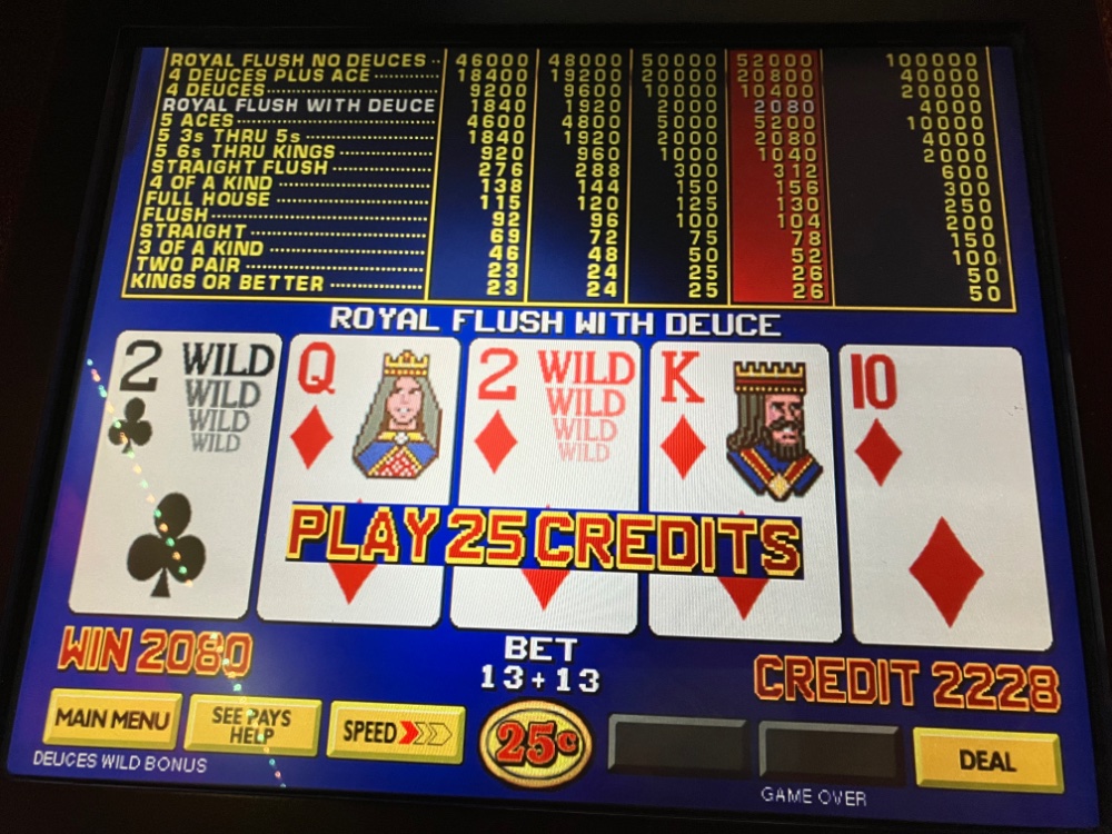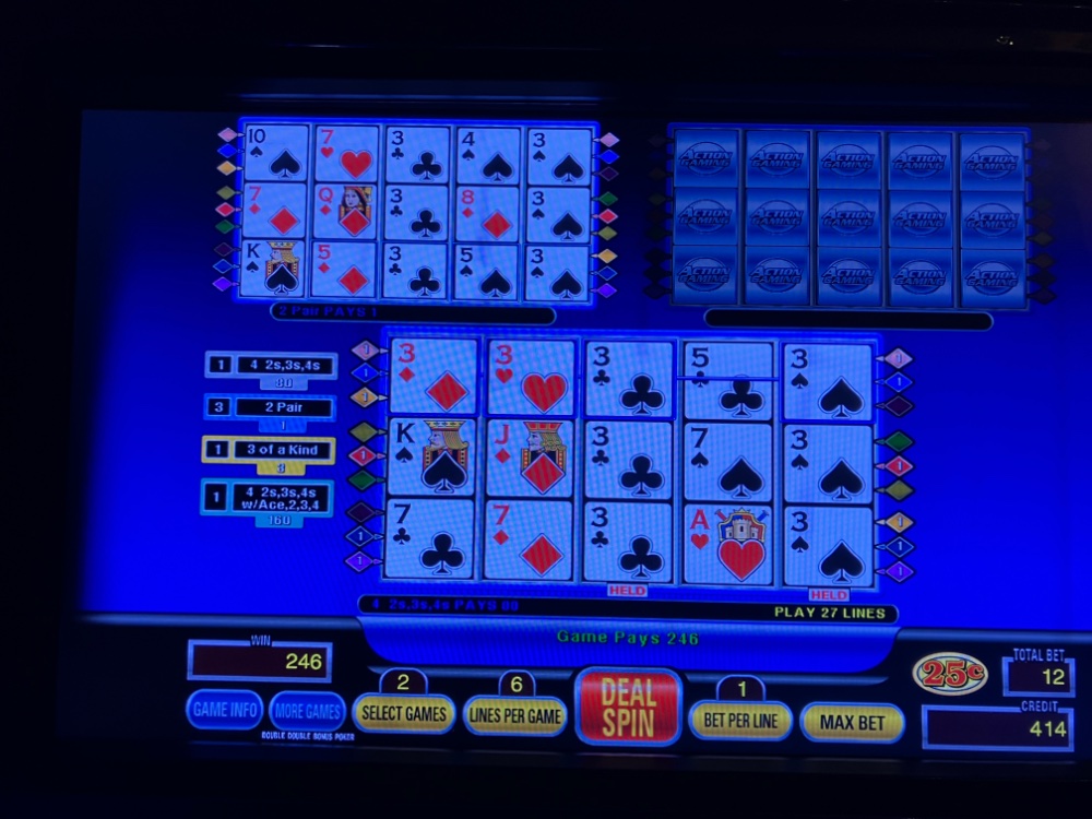 I got back from Bizarro late this afternoon. Ended up a few hundred so no complaints. I played about 12 hours total. 9 last night and 3 today. I tried 3 different games first on Triple Spin Poker. Nothing special. The dud streaks were too long on DDB. No Royals or even quad Deuces on deuces wild. No Aces on DDB. No 5 of a kinds on Joker kings. By far the best streak was on of all things DDS Deuces Wild. The biggest losses were on single line Joker Kings and Deuces Wild. The Clone was used for everything. A few pics attached. On Triple Spin. There were many more quads than what I am sending. Unfortunately, I gave a good chunk back from the DDB. I tried it on dollars after. No good. Made an extra hundred on the way out the door with JOB Ct.