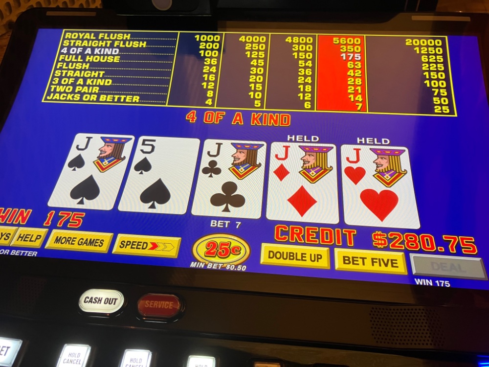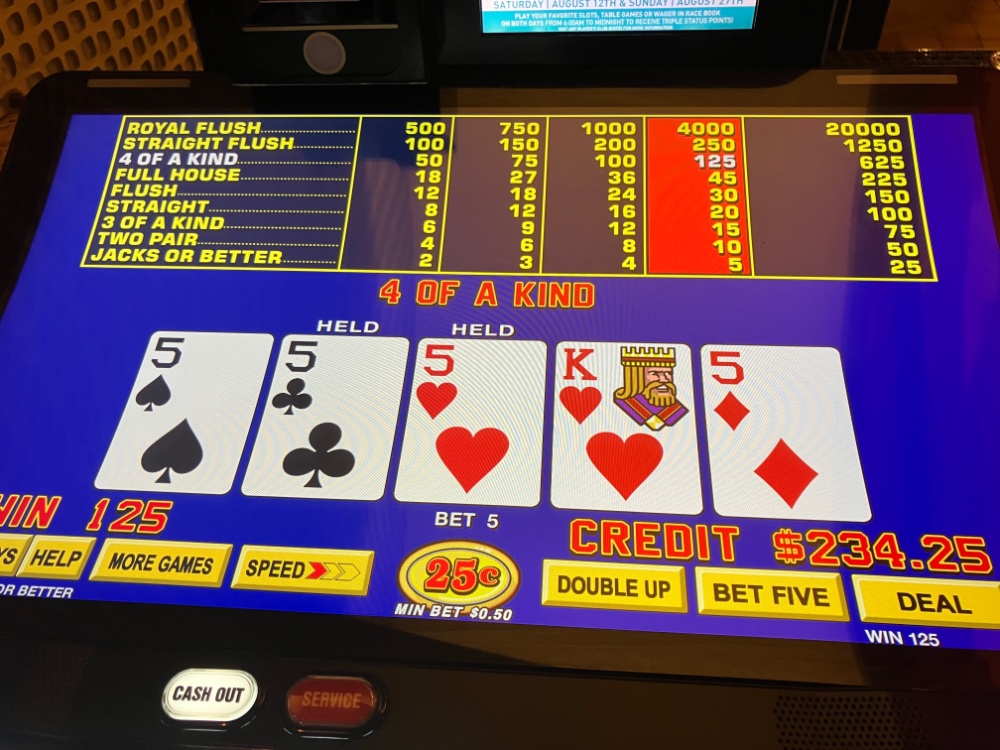 Thanks. Just got home. Picked up another hundred today playing the same way as last night for 2 hours. Only one quad today. I did earn a free play award 100 bucks I will use tomorrow when we both go up tomorrow evening