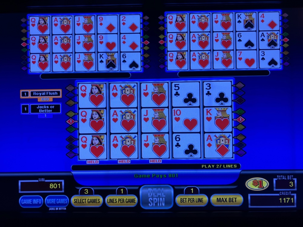 Wish it was 9/6. It is only 8/5, but with the clone, it seems to be able to weather the difference. At least for now. Single line yes 9/6. Not one of these consecutive winning trips recently hit a Royal, but I think the secret like I have always said is to hit and run. The running is my biggest issue. Been better at it lately. By the way, those two triple spin machines are 800 for bet one and 940 for 1 on Joker Kings. On most winning sessions using the clone, I will be down and because of the betting progression upon losing x number of deals, one good dealt hand like a full house will put you back on the plus side with enough hands bet and enough bet per line. Those two machines also only allow 5 bets per line. If you bet all 27 lines x 5 a line, that is a 33.75 bet.