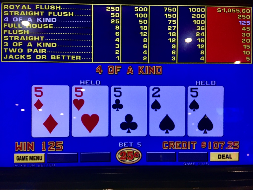 Tortured Tuesday. I won my $25 Caesars table FP on a self rolled seven. I won $12 on my $25 machine dollar JOB FP. I soon hit a small quad. Switching to quarter yielded a max quad fifteen minutes later. I treaded water for forty five minutes until a medium quad. The next max quarter quad took ninety minutes. I hit dollar carousel and went dizzy on tilt. But I was bailed out by a max quad deuces. Net Day: -$64. 153 TCs.