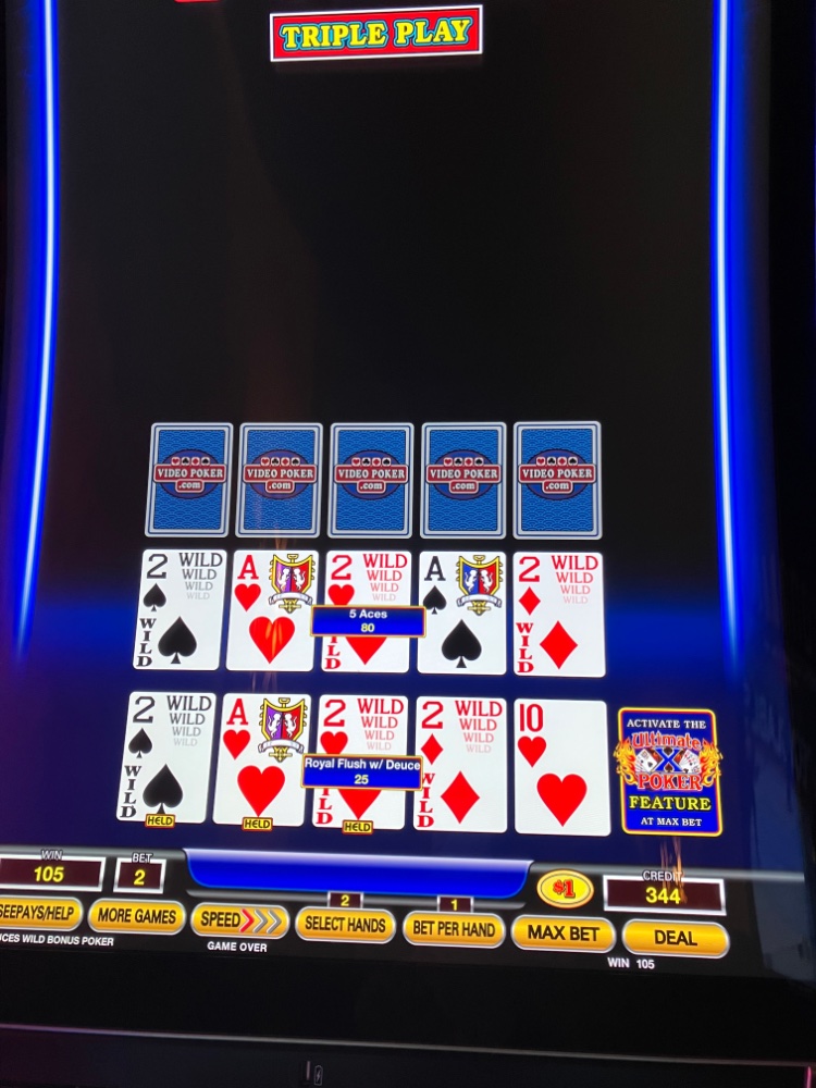 This was a big tall glitzy upright machine part of a cube of 3. The other 2 were non Vp machines. I will take a pic of the entire cube another time. Not counting the Ultimate X feature the pay table 20/13/4/3/3/1/1. The 20 being for the cheapest 5 of a kind and 13 for the straight flush. Unfortunately, it is not an 800 for bet 1 for the Royal. It is a 98.8 table not counting the Ultimate X feature. Dollar and up required for bets. Most all of the other Bonus Deuces pay-tables around are 20/10/4/3/3/1/1/ or 20/12/4/3/2/1/1. Both poor. Above I said the pay table was excellent. I really should have said not bad. The excellent was in relation to others found throughout the casino listed above. The machine not that I care has a fireworks animation feature on decent hits. I guess it’s an attempt to lure away patrons from some of the glitzy penny machines and impress the crowds walking by.