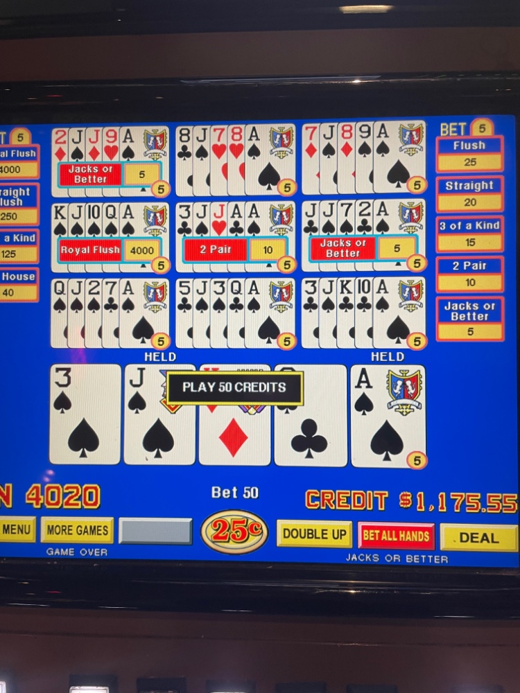Our past 6-8 trips have been "no bueno" with a few hits. I've even had to play extra $ along with my free play (slots only for free play) to try to get my annual tier points. Thursday night was a fairly good start and it got a lot better when this beauty hit. Friday was the concert. Bill Medley still has it 70-80% at 83! Bucky the replacement for Bobby Hatfield did a wonderful job. After the concert I was basically trying to add point ($10VP/1 tier point). I was pleasantly surprised to catch this 25¢ Royal holding an A+J. Finally, around 1:00 am I finally hit 4 deuces. Since I haven't posted lately here are two additional posts.