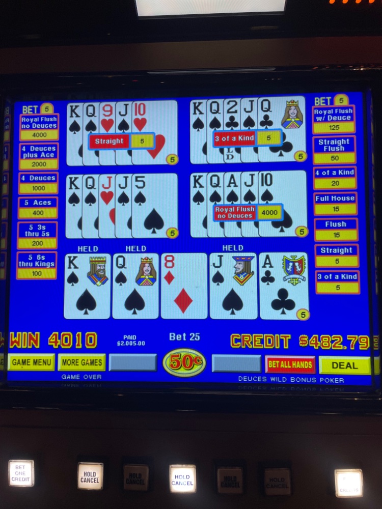 Friday was the concert. Bill Medley still has it 70-80% at 83! Bucky the replacement for Bobby Hatfield did a wonderful job. After the concert I was basically trying to add point ($10VP/1 tier point). I was pleasantly surprised to catch this 25¢ Royal holding an A+J. Finally, around 1:00 am I finally hit 4 deuces.