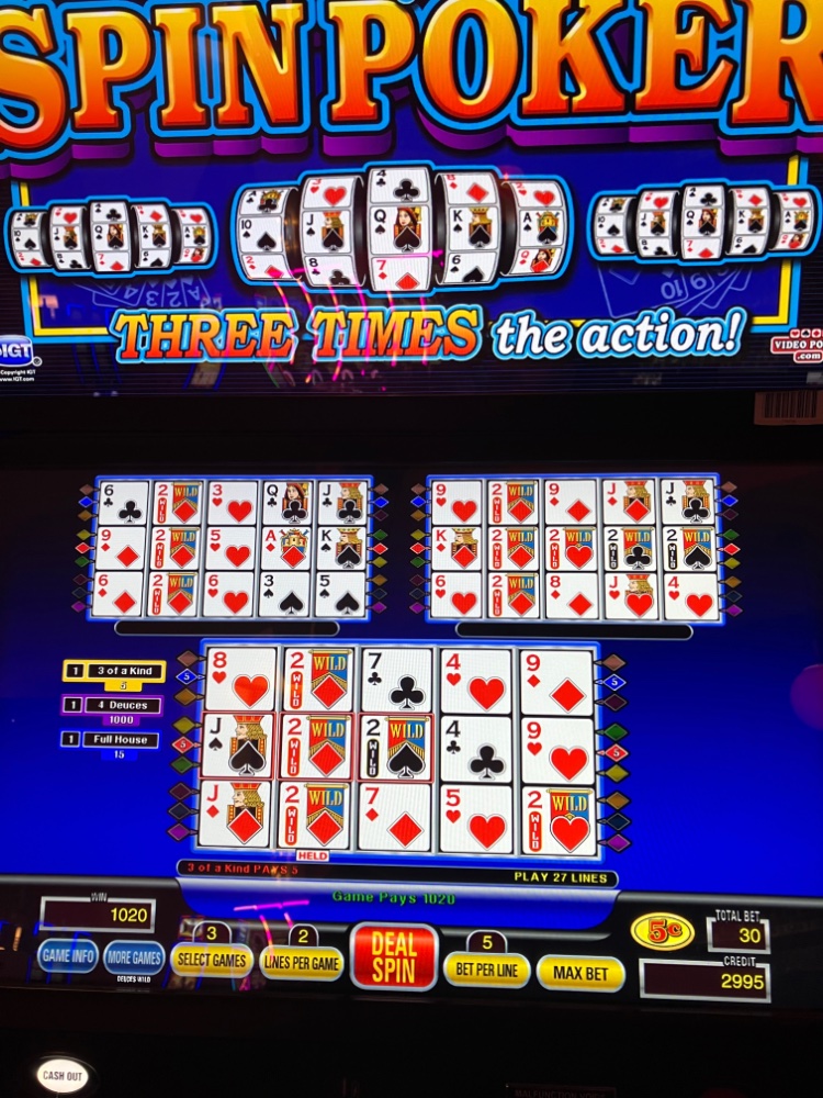 Back from a solo overnight. Lots of play. Pretty good results. Stuck with nickels and dimes. I played 10 hours with the same 20 in free play and ended up a bit over 200. What is unusual about that is no Royals were hit. The machine is only a 96 percent machine 16/13 regular Deuces Triple Spin Poker. I also am going to light some fires as I not only played a 96 percent machine, I went against the math for the entire session, while playing Martingale Clone. Anytime I went with the math, I would lose and would have to start all over again playing the incorrect way. Time will tell if this will work long term, but I think it will as it has a lot to do with playing multiple games and lines and varying bets per line. These aren’t even all of the pictures. There were other good hands as well with dealt hands like straight flushes and a Wild Royal or two. Time will tell. No use posting the details except to mention some of the play against the math. If I have a single deuce and two more cards toward a straight flush, I am only holding the Deuce. There are also certain straights I don’t draw to. Here’s some of the pics over 10 hours of play. My best guess is between 90,000 and 100,000 hands were played in the 10 hours