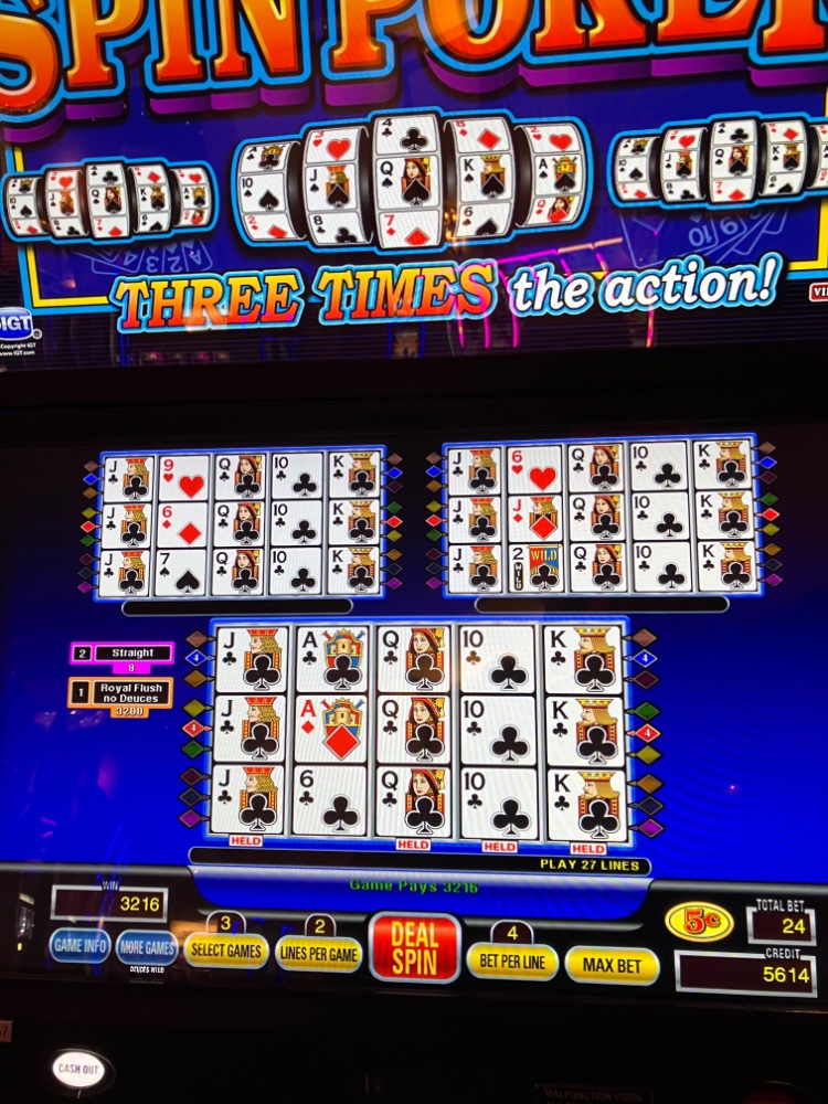 Getting ready to head home. I played overnight last night and about 6 hours today too. No complaints. Looks like a ton on hits, but I was playing a ton of hands. I did hit 4 Royals though. Everything on nickels, though the bets got high there too. Plus 300 for the trip. Stuck with Nartingale Clone the entire time. Same only 96 percent machine.