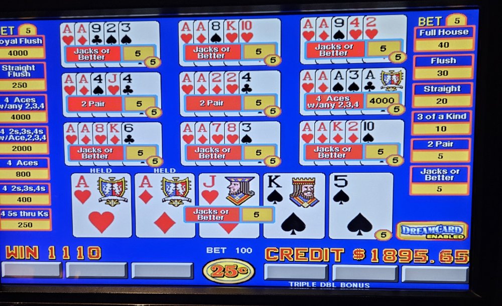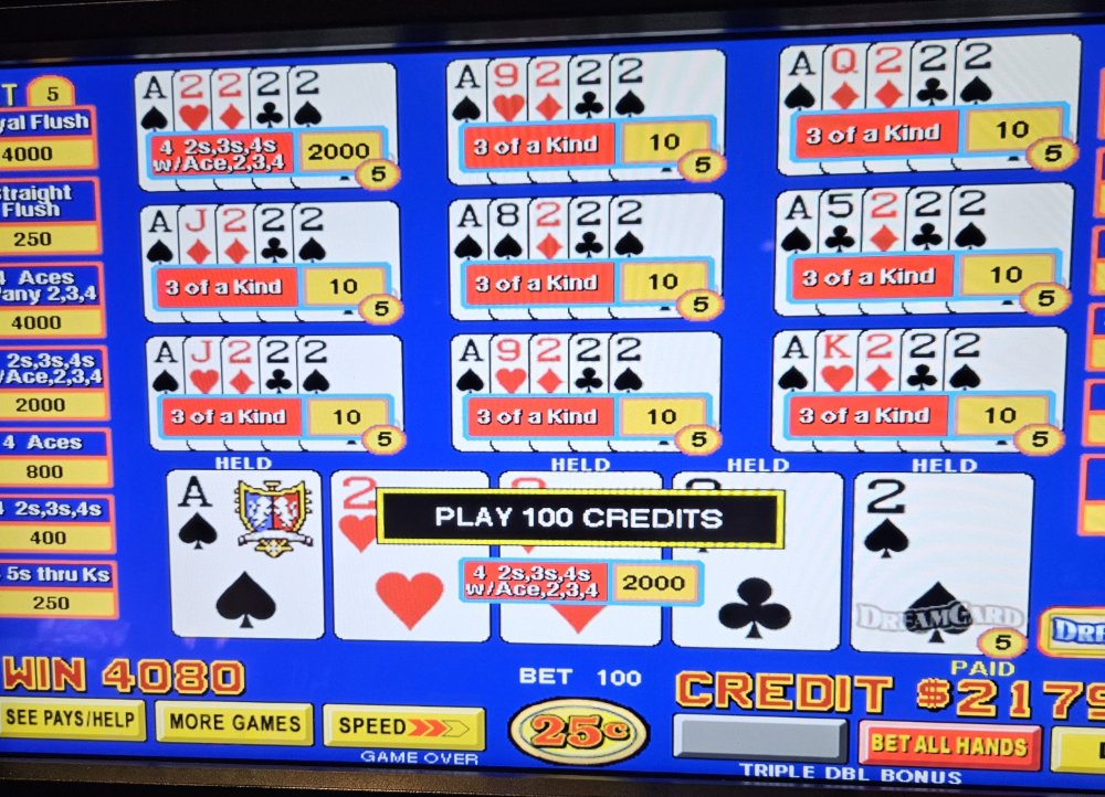 The session was about 3 hours. I tried some Double Super Times Pay, lost $300.00. Tried a Buffalo slot, lost $400.00. Went back to Dream Card and hit the last AWAK's, quad 2's w/A, and dealt 10's after returning to the machine.
