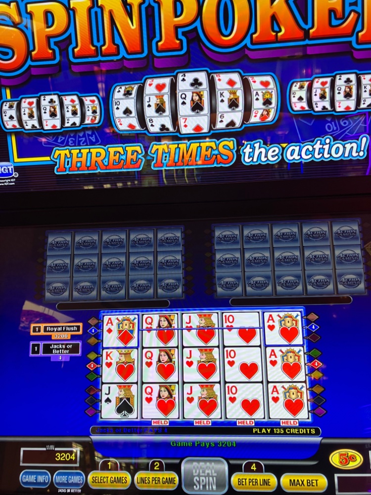 Small bankroll solo trip last night. Of course a Royal appeared. I’m glad, but playing for one on quarters or dollars was/is just getting too expensive. The out of pocket med bill had already busted my VP budget too.