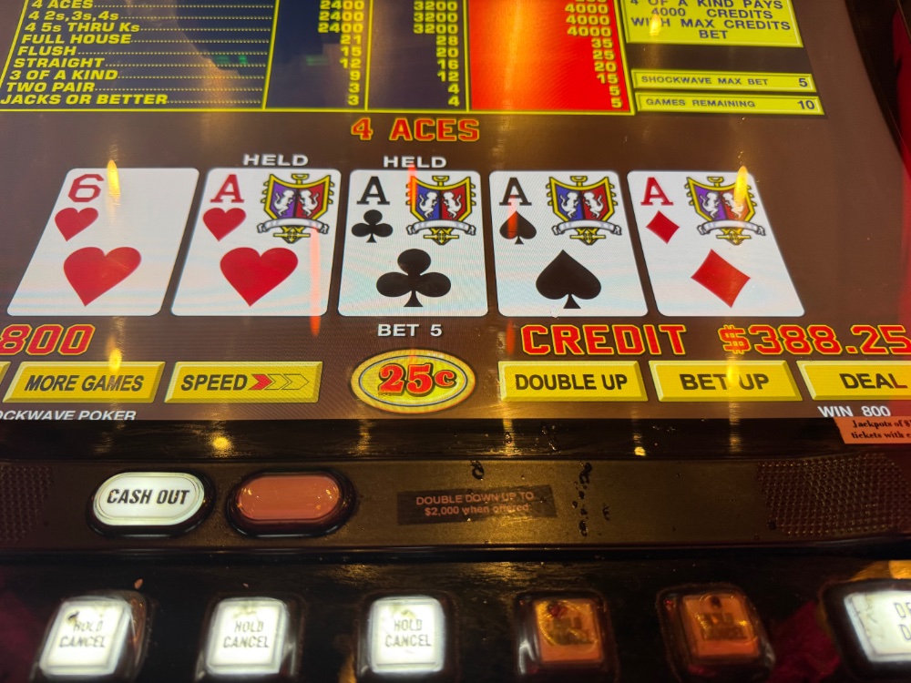 Back to Harrahs’s after 2 bad trips. Turned the table. Went to the VP Bar with $20, proceeded to get into the Shock Wave 4 times. But alas 40 shots, no 4 oak. Ate at Happy Hour at M & S. Still one of the greatest burgers