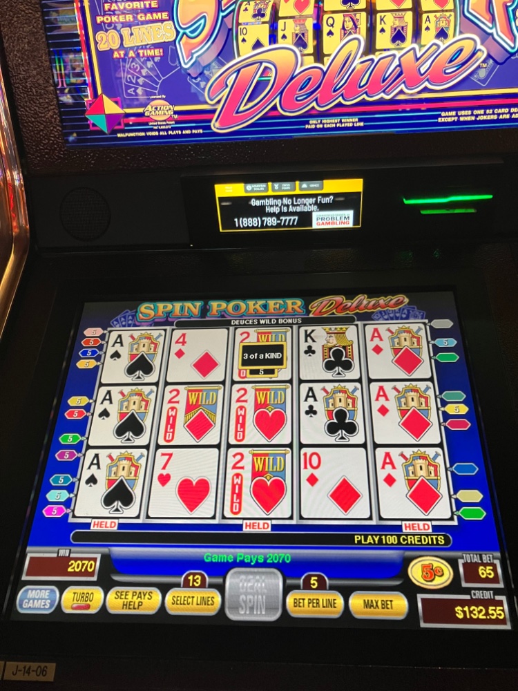 Needed a small wind down session! Unusual play results on Wednesday evening and Thursday morning, but no damage done. Stuck to 3,5, and a little 10 cent play on Spin Poker. No quad Deuces in over 40,000 hands, no Royal, but several hits of 5 Aces on Bonus Deuces Wild! This was the best one! Net day…..up 80 cents for the trip.