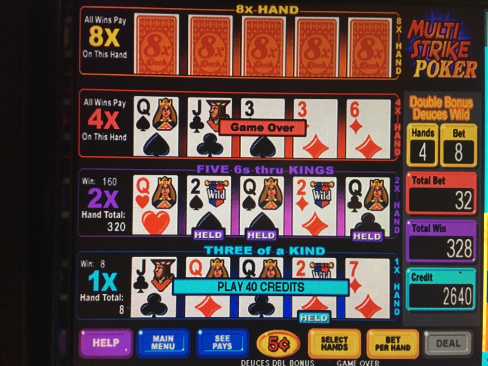 My bet was getting dangerously high at eight per line. I got pretty lucky with five Queens on the second line so I am back up 32 bucks on the original hundred I put in