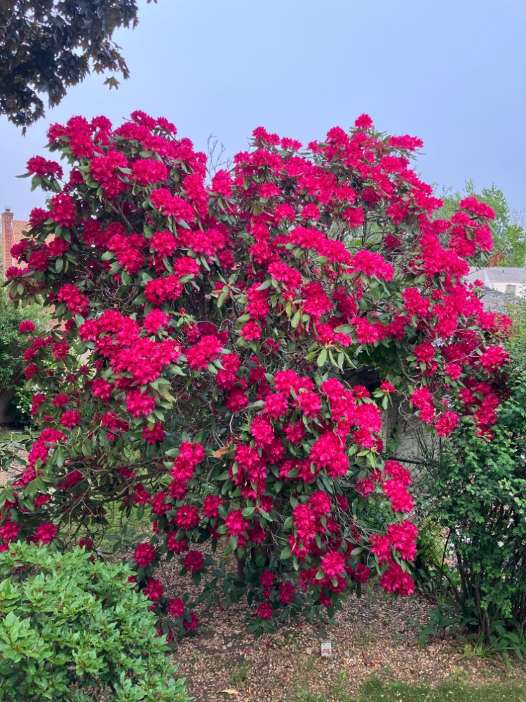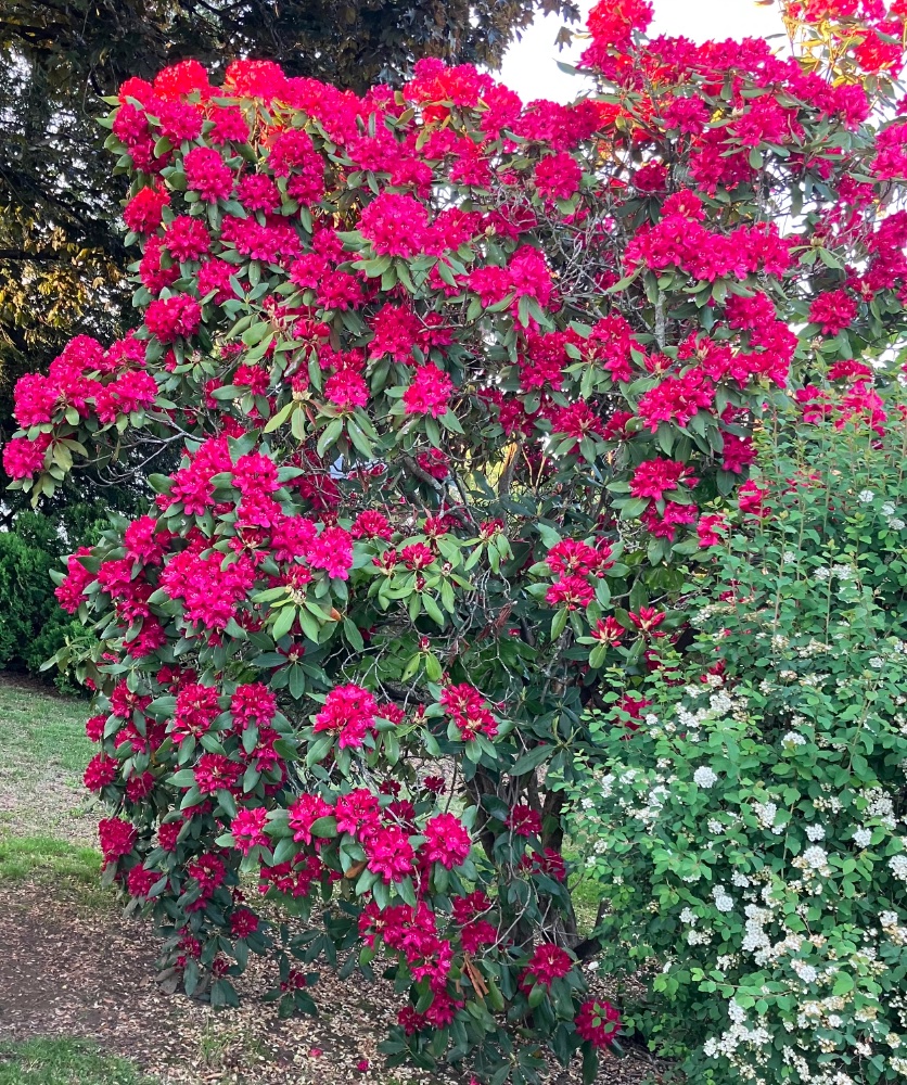 These aren’t quite in full bloom yet, but the pics will give you an idea how big the rhododendrons get. They were just little plants when we planted them almost 50 years ago.