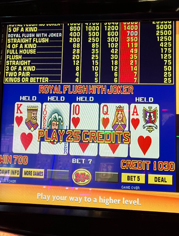 The Mrs pocketed the 2 four leaf clovers that the Come Back Kid had sent her and proceeded in short order to be Dealt 4 Deuces on a 50 cent DDS game. That was good for 400 bucks. Pic I will post when she sends it over to my phone.