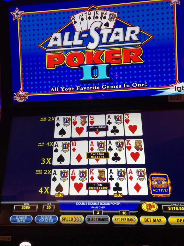 We made an overnight trip Sunday night. The Prime Rib in the Lounge and the Mrs did very well on nickel DDB Ultimate X. She caught quad Aces with a 4 Multiplier.