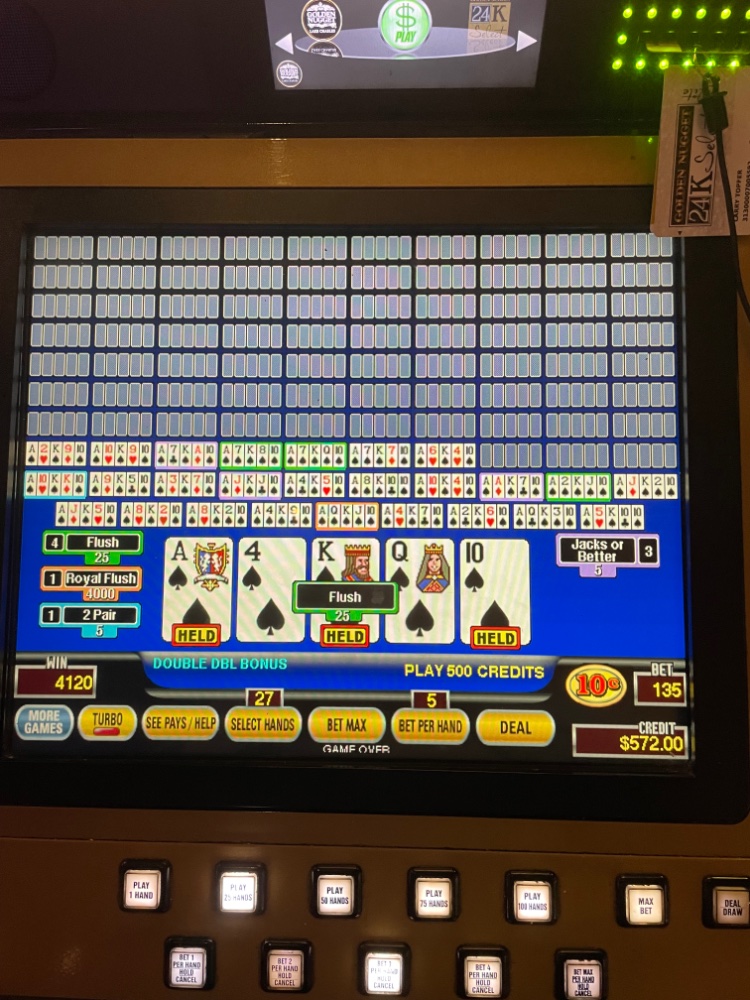 Sweet C and I usually take a two day trip and come home late on Day #2. We usually eat an late afternoon dinner and play $100 each before heading home. Sometimes we can play a short time and head home other times we get on a roll. Within 20 minutes Sweet C came around to where I was playing 10¢-10 hands/deal on a 100 play machine. DDB gave me a quad Aces for a nice $80 bump. A premonition told me to go to TDB which I may play .001% of the time. A few hands in a dealt A hits Aces /4 for $400. Cash out and bankroll Sweet C. A few minutes after resuming and moving up a hand or two at a time up to 20 hands 3 Aces led to 1X4 Aces and another 4 Aces/2. 30 minutes later and up to 27 hands AK10 spades on DDB led to to RF. Less than 10 minutes later back on TDB dealt A222 led to 2XA2222 for another $400. Thirty-three hands and dealt 22 on DW led to 2 4Deuces. Twenty minutes and shortly after 6:00 35 hands with AA caught one AAA4A to closed out the evening and a drive home.