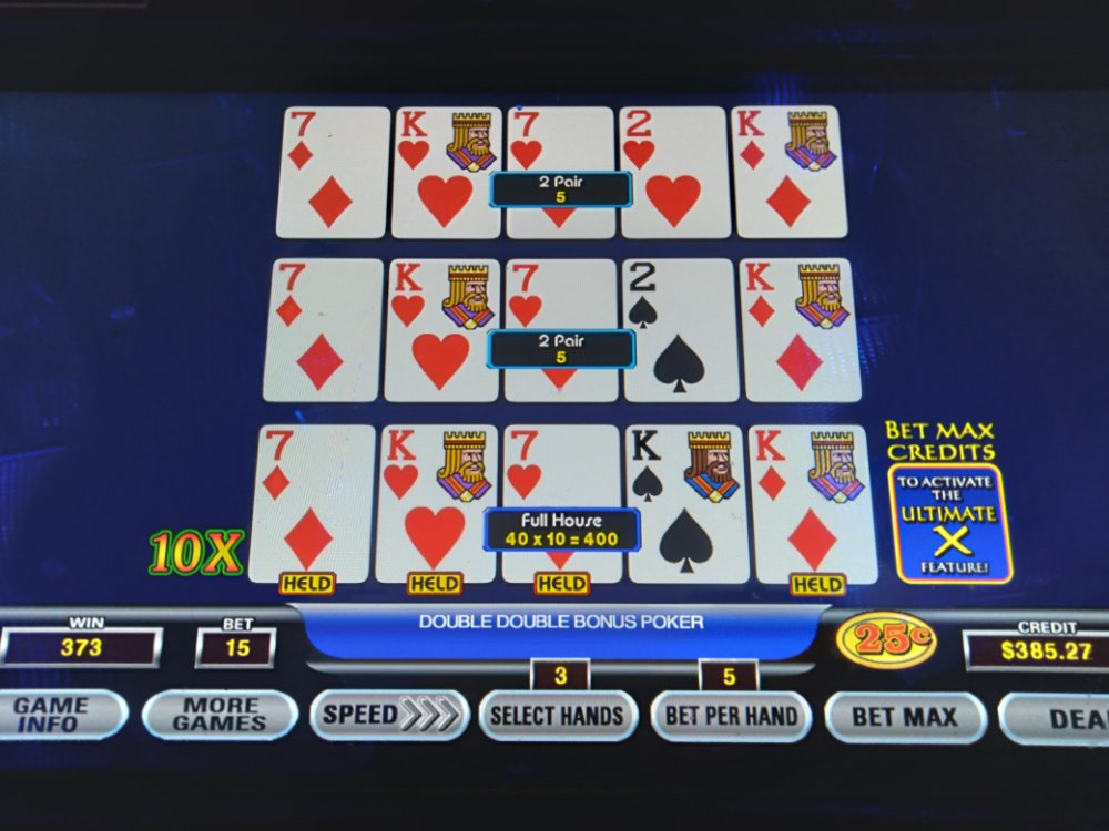 I rarely see more than 2x left on the screen. I have tried it a few times and lost every time. Then like an idiot, I stuff in a hundred on an 8/5 JOB or 8/5 DDB machine and lose that too in ten minutes on a triple play machine. Most recently, I tried it hoping the player next to me who was almost out of money would leave the single line game I wanted. Every time he would get down to the last bet, it would hit say a full house. 2 hundred bucks and 20 minutes later I got up and left learning a valuable lesson.