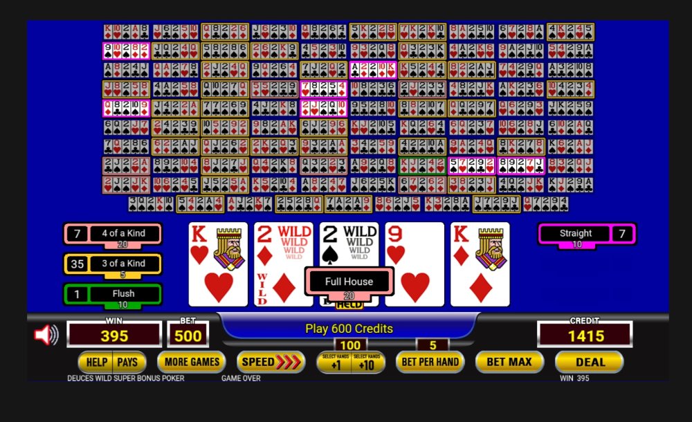 Speaking of 100 play wheel poker Super Bonus Deuces Wild. While playing the other day on this hand, the first hand draw was a four of a kind but it showed the win as a Full House. Even though both pay 20 credits, it was just another weird glitch.