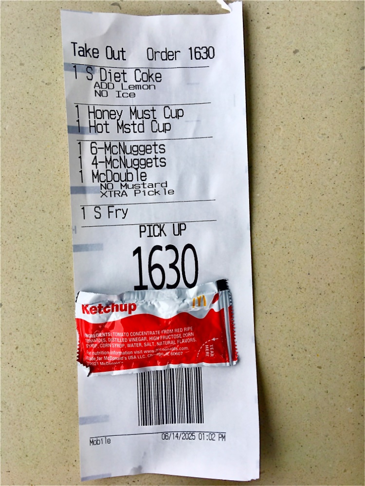 Frugal FAA spent $5.33 on all this. The offer was one I could not refuse. A free six piece McNuggets after a Phillies win. I picked off the coating on all ten and blotted the fries. Only 1 ketchup packet and the honey mustard. I waited for the meal under the “Pick Up Here” sign, but my number never got listed. An employee saw that I was there too long. She saw my number. “Oh, you’re a mobile order. Around the corner to the other counter.” I like their segregated system. Great once customers are aware of it.