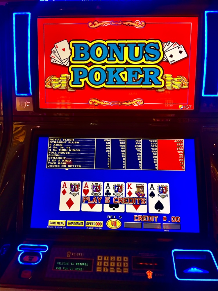 I returned to Resorts a conqueror after my Marina moolah session, highlighted by a max quad Aces. Out of curiosity, I stopped in at the HL room and checked the machine I played before exiting for lunch and Harrah’s. This was the last played hand of BP. Identical to my Harrah’s Aces hand, down to the spare King. Resorts really should have bestowed this upon me this morning and saved me the seventy five cents I burned on a jitney trip. But they rewarded the guy across from me. He probably nailed this too. What are you going to do?