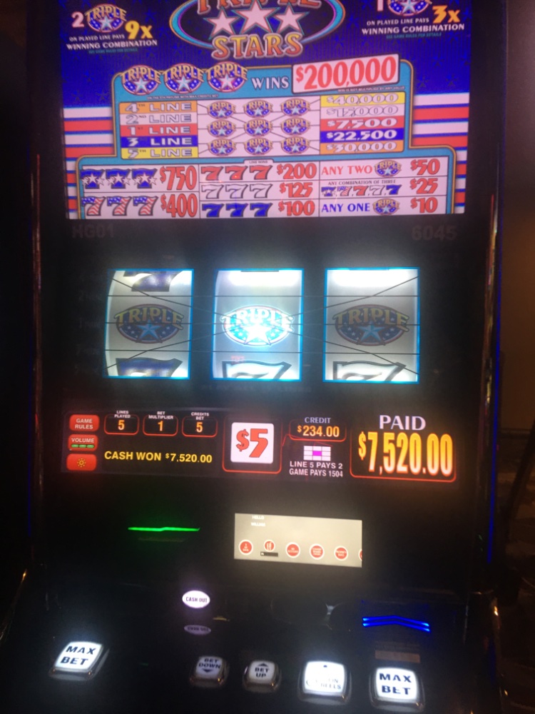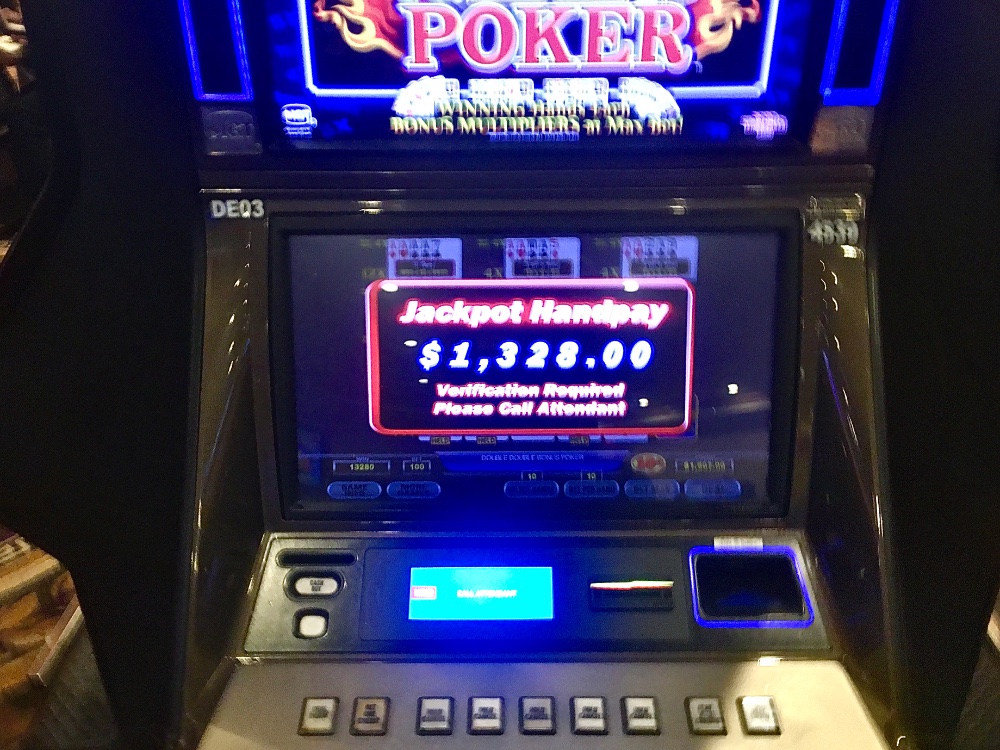 Machines here were as hot as the weather today. After my astonishing and compressed two Straight Flush hits, I walked towards the boardwalk, but doubled back to check if there were even greater gifts distributed. Sure enough, at my dollar carousel, a man hit an $8,000 RF on JOB!