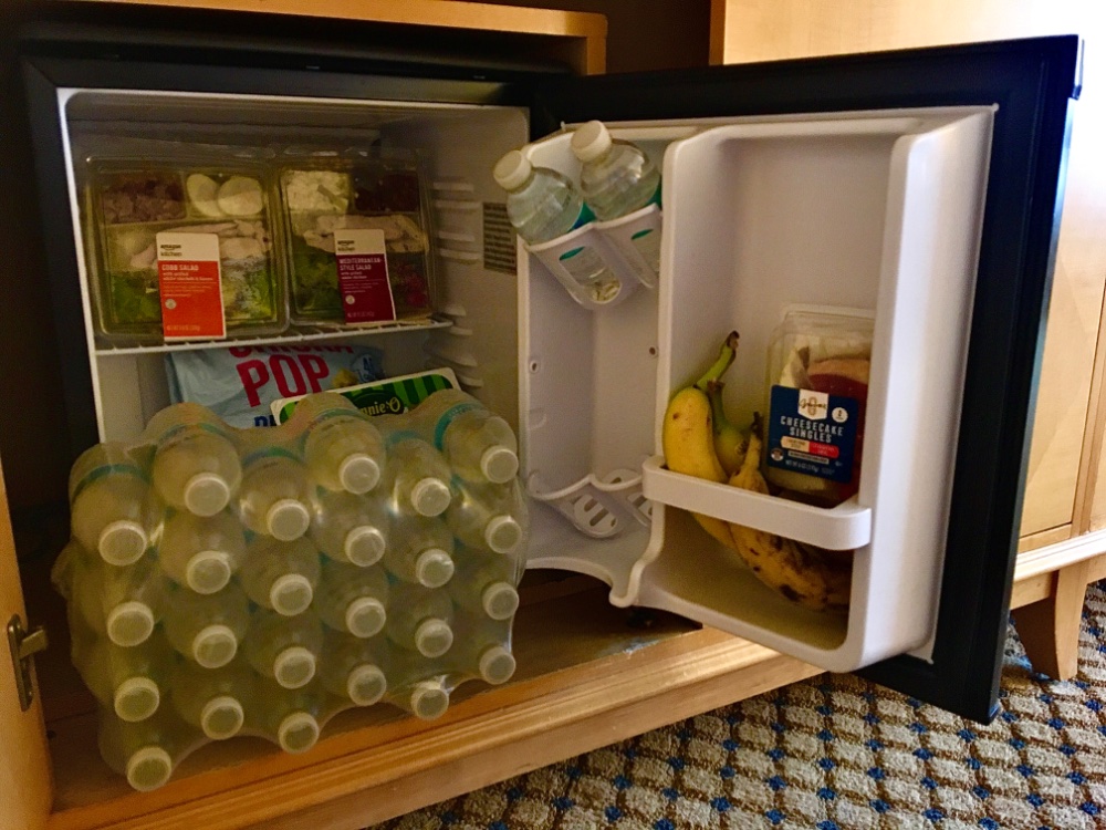 My usual top floor room at the end of the hall. I asked housekeeping for towels and water. To my astonishment, I got 24 bottles, still encased in plastic. They must really want to prevent future calls. Despite the generosity, I was left with the distinct impression that I was being flipped the bird. Any thoughts?