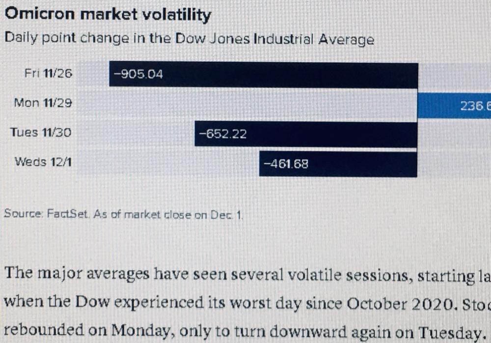 I have been anticipating a severe downturn for a long time. Between Powell’s remarks and Omicron, the overvalued market was looking for an excuse to go down. Stay tuned as Russia and China are up to no good I am afraid. Impossible to outguess the market. At this point, I am content to sit with mostly Municipal bond funds, high dividend paying bond funds, and a few keepers. I knew Disney was going to tank a couple of months ago. Highly overvalued, problems with several in process business decisions, Covid, and other news. My brother and sister bailed in time on my advice, but my wife and daughter are huge Disney fans, so here I sit with mine ever after a 50 point retracement. At this point, my crystal ball is simply saying “ Tread lightly, but carry a big stick. “ the above of course is just my own opinion. I am my own financial advisor. That way, just like VP mistakes, I have no one to blame but myself.
