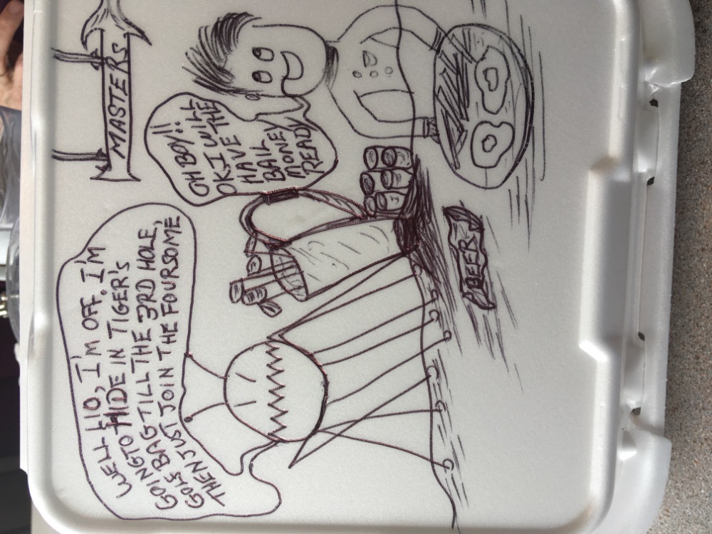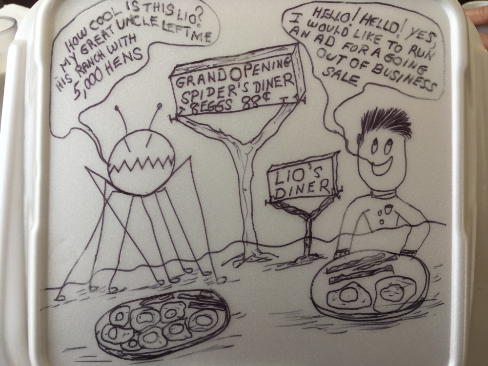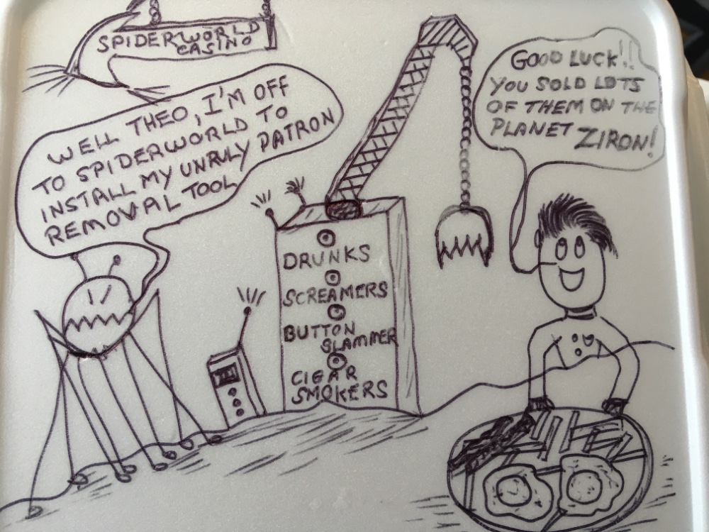 Latest scribble done on my late breakfast takeout container.