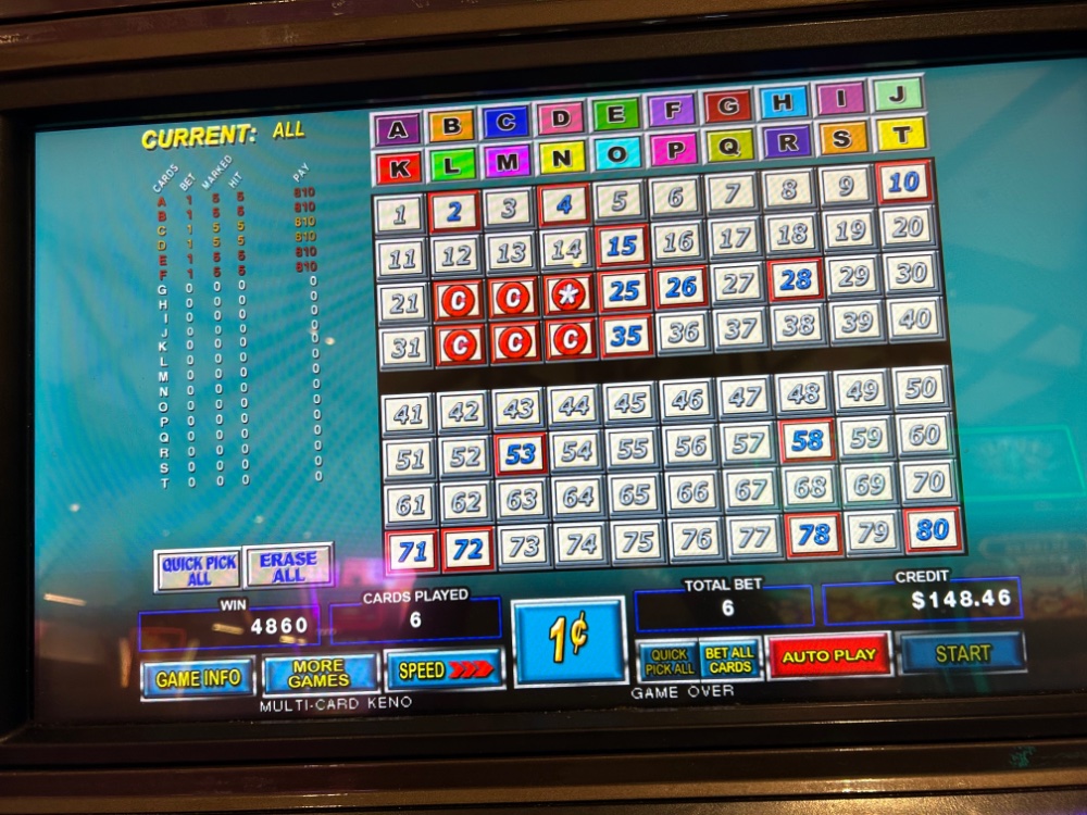 Ok so here is a keno win that shows the ULTIMATE low wager. A 6 cent bet that returns 48 dollars.