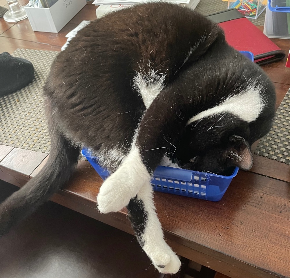 Thanks. It really is and the ultimate stress relief. We have several miles of beach all public and even free parking at one of the parks for non residents. Today is 76 and low humidity. Plan a long walk when my chores 😬 and appointment is done. Speaking of stress relief, here is my laugh of the day. My sister’s cat in Sonoma trying to get comfortable and trying to sleep in a tiny basket.